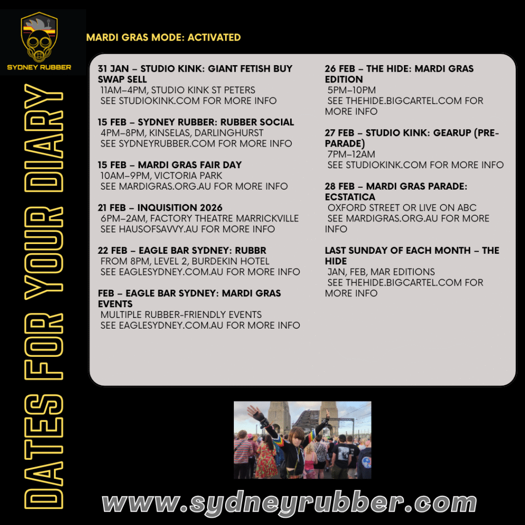 Mardi Gras season is one of the best times of year to be part of Sydney’s kink and rubber community, and we’re keen to enjoy it together. From socials and parties to parades, dancefloors, and shine stations, there’s no shortage of ways to connect, celebrate, and support one another.