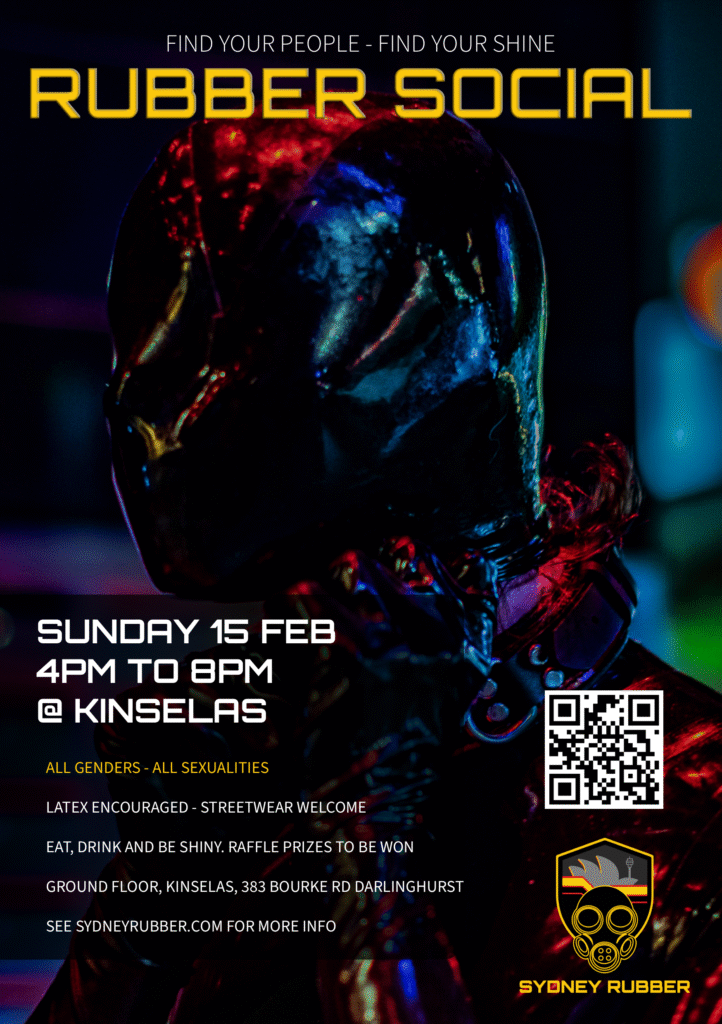 Our first Rubber Social of 2026 is almost here, and we’re kicking the year off properly. Join us Sunday 15 February at Kinselas for a relaxed, welcoming afternoon with your rubber people. Whether you’re coming straight from Fair Day or just easing into Mardi Gras season, this is your chance to grab a feed, catch up with friends, and maybe slip into something a little more comfortable as the afternoon rolls on.