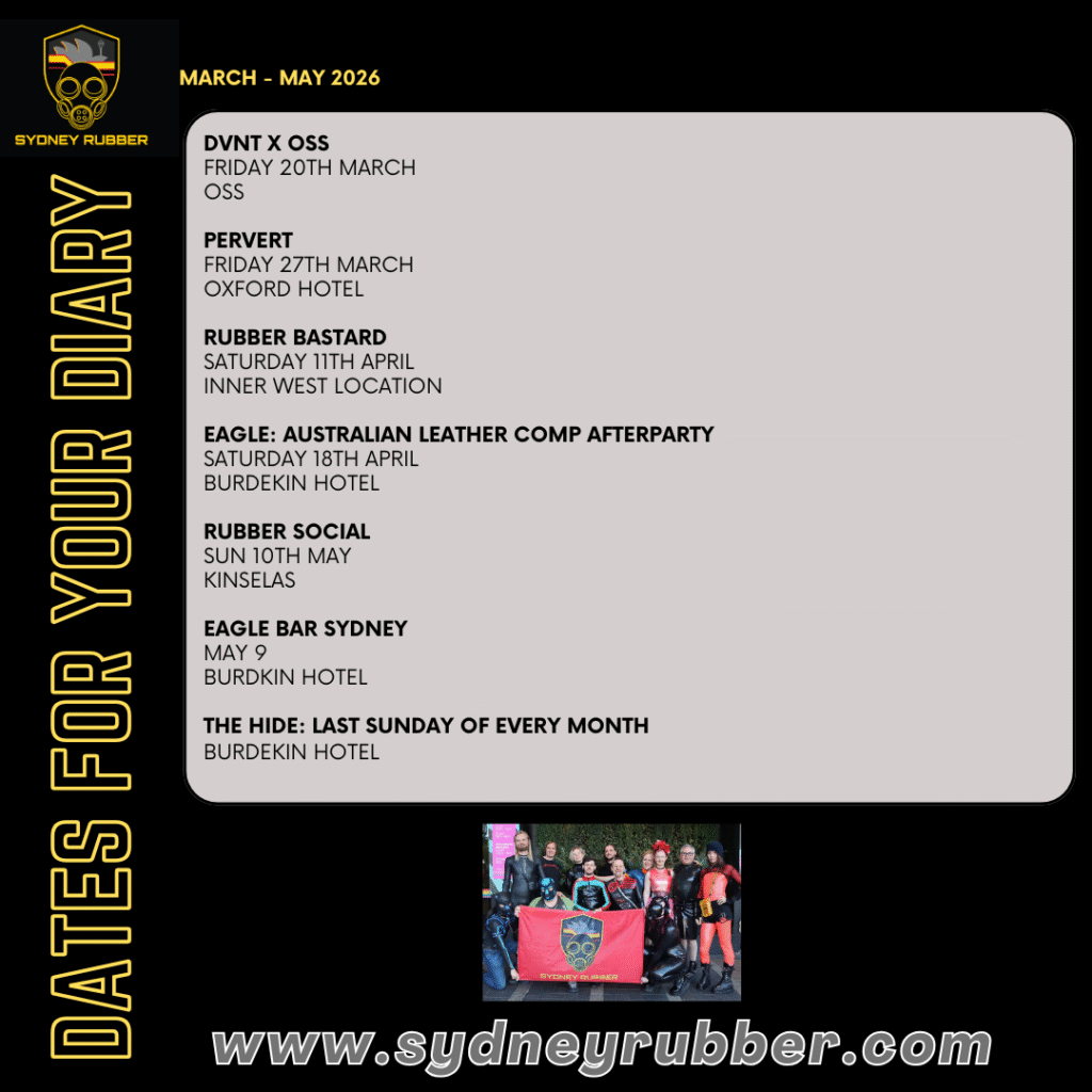 There’s plenty coming up across the rubber, leather and kink scene over the next couple of months. From play parties to dance floors and our next Sydney Rubber Social, there are lots of chances to get shiny, catch up with friends, and meet some new faces along the way. Check out thes Dates For Your Diary so you don’t miss anything.